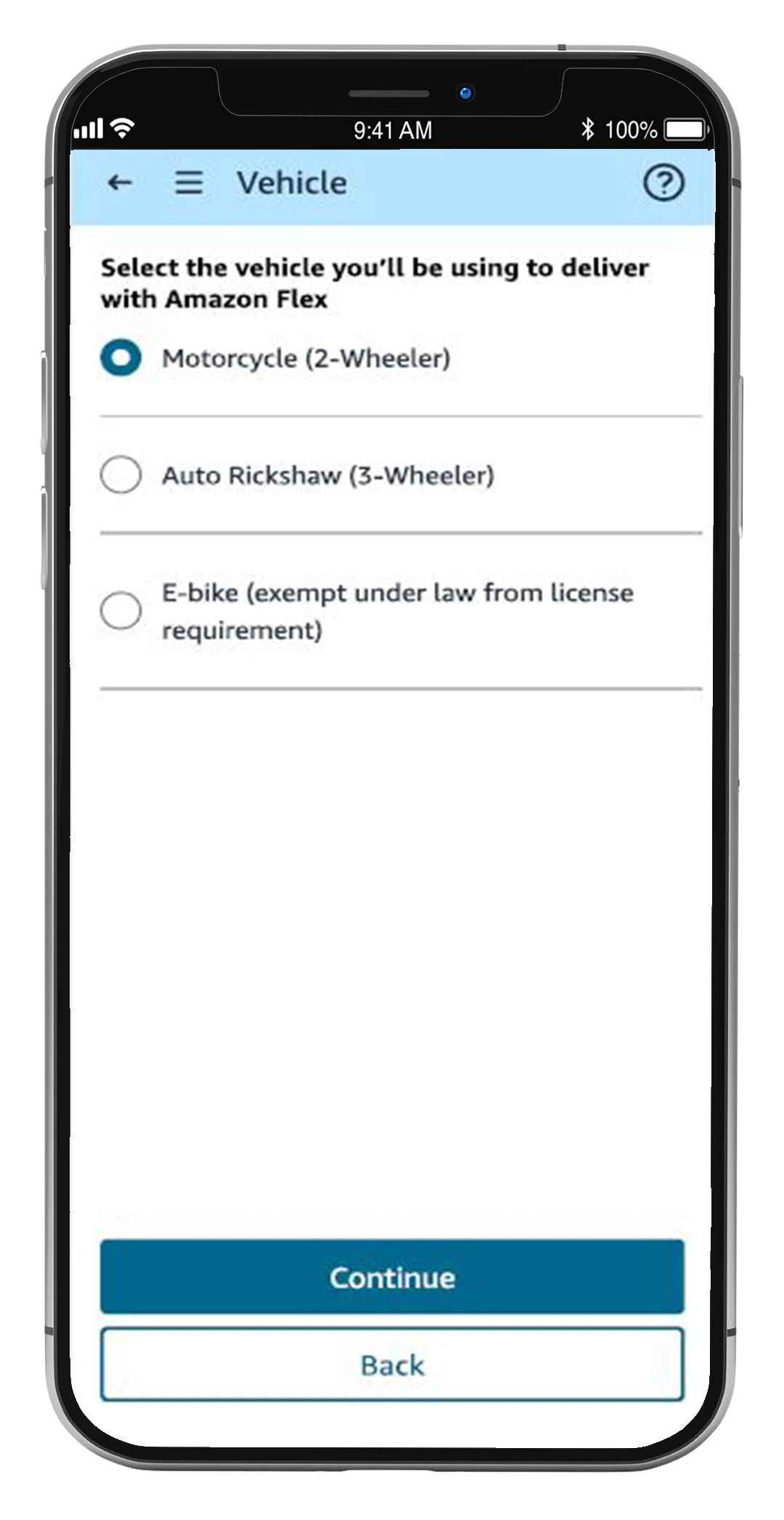 3. On the Vehicle screen, select: Auto Rickshaw (3-Wheeler) or Motorcycle (2-Wheeler)